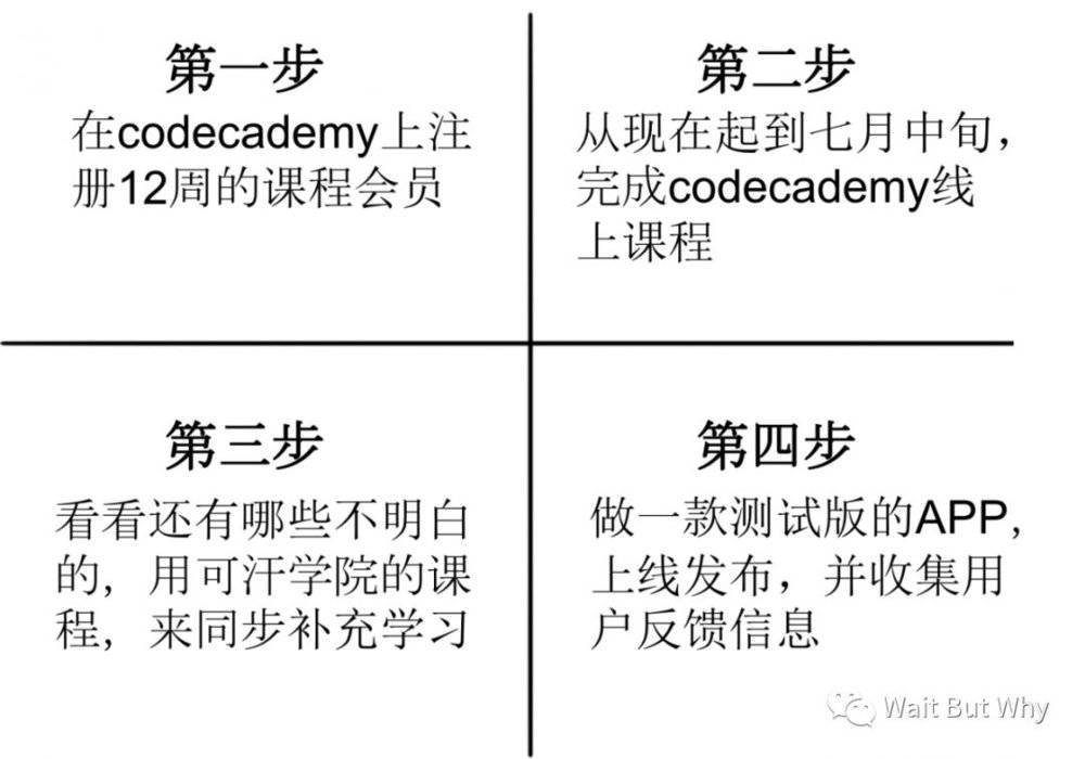 假设你的梦想是开发自己的APP,你知道如果你成功开发出一个APP,你就可以辞掉工作,成为一名全职开发者。你没钱请外包团队开发,所以你决定在待办清单中把“学习如何编程”作为首要任务。听起来让人兴奋,对吧?