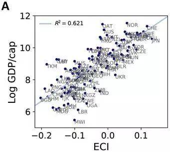 图8: Mealy 等人绘制的人均 GDP 与经济复杂性指数相关性图像,可以看出 GDP 与经济复杂性指数呈现正相关(图片来源:Mealy et al., 2019)