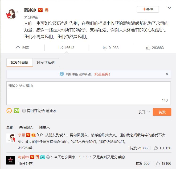 就在昨天,“双宋”宋仲基、宋慧乔宣布离婚之后,晚上8点24分,演员范冰冰发布微博宣布和男友李晨分手,结束了长达四年的恋情。李晨在转发中提到:“从朋友到爱人,再做回朋友,情感的形式会变,但你我之间最纯粹的感受不会变,彼此的信任与支持是永恒的。我们不再是我们,我们依然是我们。”