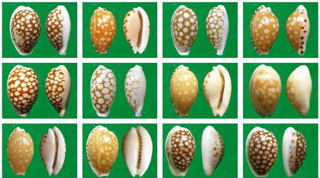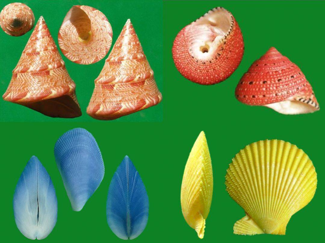 贝壳除了到处都有以外,还有很多其他的多样性问题,比如说颜色。这都是海贝,红色的、蓝色的、黄色的、黑色的、绿色的……