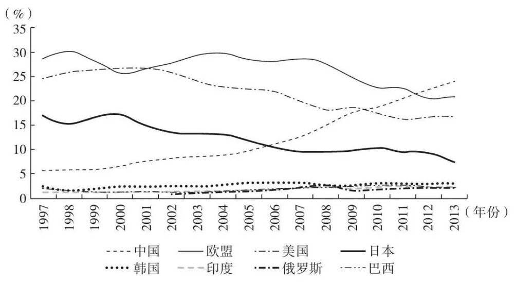 图2.3 1997—2013年各经济体在世界制造业中的占比