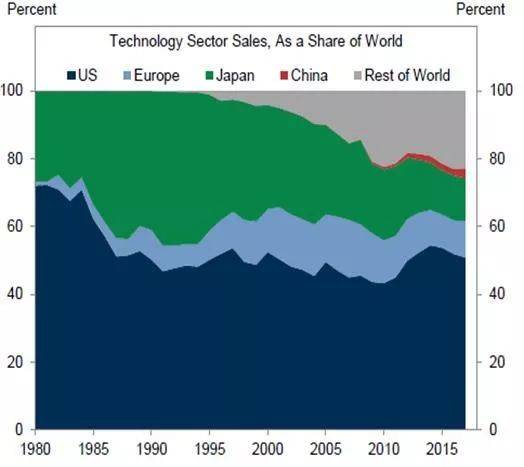 图2.6表示的是全球技术产品销售各国所占的份额。2015年美国占全球科技产品总销售50%,高居榜首;欧洲占5%;日本占10%左右;中国占3%。