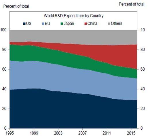 图2.7表示的是全球各国研发的投入比较,中国在最短时间内追上了美国。