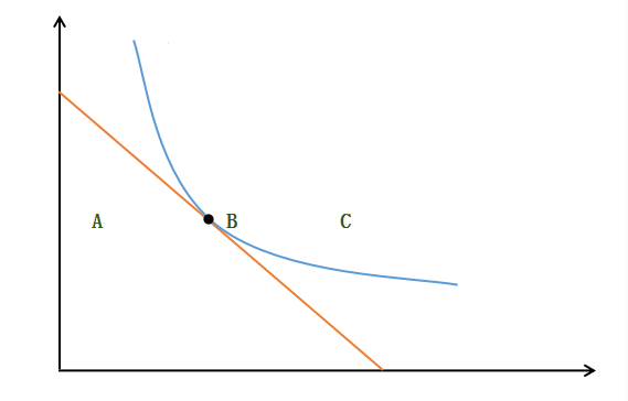 如图,当司法资源的预算约束线与社无差异曲线的相切(B),社会效用达到最大化。