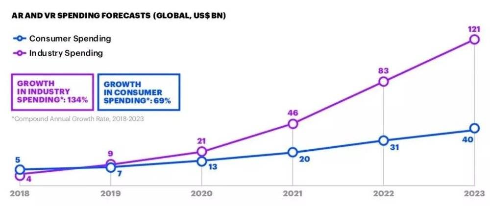 劳动力培训效率的提高是其中的关键环节。据IDC预测,在2018年至2023年间,AR培训支出将以46%的年复合增长率持续上升,在2023年达到80亿美元以上。