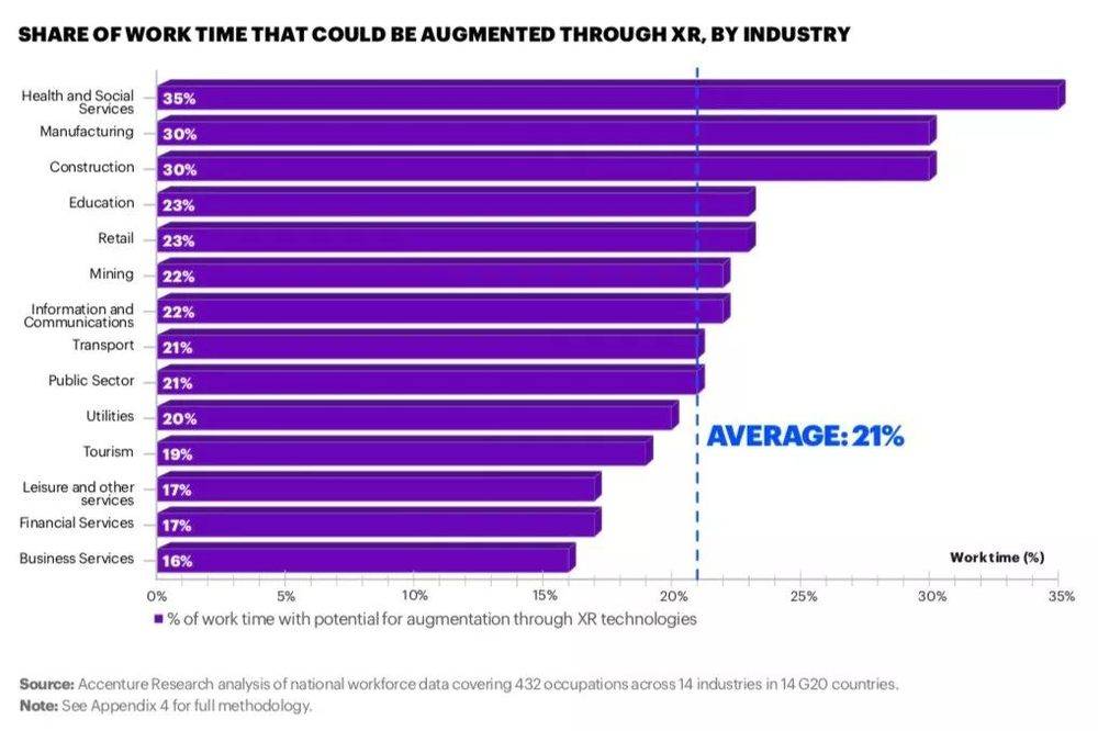 体力劳动、设备维护等人工智能助益较少的领域,生产力提高可以通过AR技术很好地实现 Source:Accenture Research analysis of national workforce data covering 432 occupations across 14 industries in 14 G20 countries.