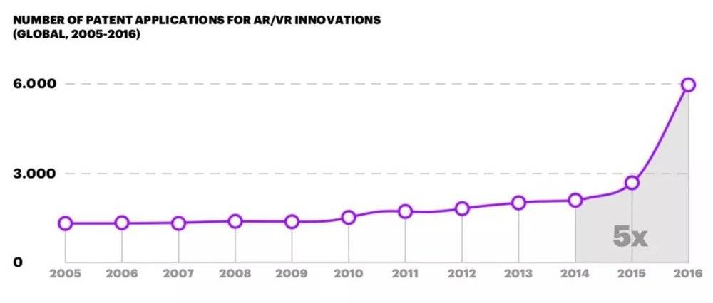 AR领域正在经历爆炸式的创新增长。2014年~2016年这段蓬勃期,该领域在全球的专利申请量增长了五倍。