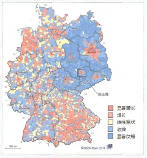 图为2014年德国各区域人口增减情况,可以看出,莱比锡人口有显著增长