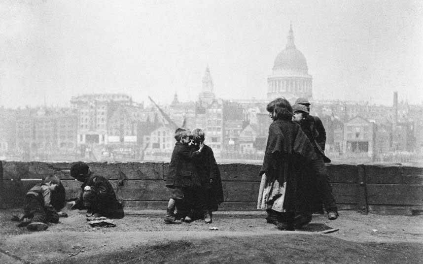 图为19世纪,孩子们在泰晤士河Southwark岸上玩耍,这里因肮脏的生活条件而被外界熟知