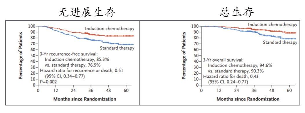 事实上,几乎和这篇论文同时,马骏教授团队在顶尖的《新英格兰医学杂志》上发表论文,证明在标准治疗的时候加入诱导化疗方案,能显著降低复发率,延长患者生存期。