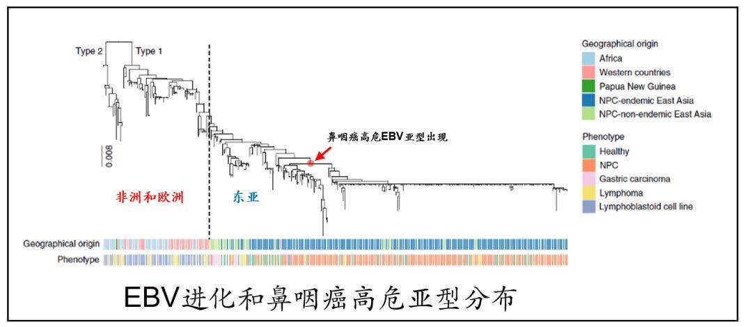 通过比较广东地区、中国北方以及世界其他地区的EBV病毒基因组,科学家发现这个病毒的传播就跟人类迁移一样,先从非洲发源,然后迁徙到了欧洲,最后到达亚洲。在这个过程中,病毒不断发生变异,某个时候,在亚洲进化出了一个高危亚型,就是前面提到的BALF2_CCT亚型。