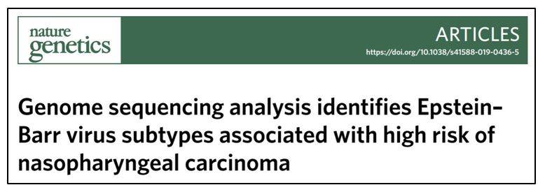 1:Genome sequencing analysis identifies Epstein-Barr virussubtypes associated with high risk of nasopharyngeal carcinoma. Nat Genet. 2019Jul;51(7):1131-1136.