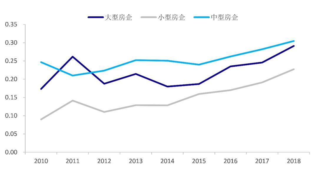 从2015年开始各类房企的合作杠杆都有上升的趋势。大、中、小型房企的合作杠杆分别从2010年的0.19、0.24、0.16上升至2018年的0.29、0.30、0.23;合作杠杆门槛较高,大、中型房企的合作杠杆明显高于小型房企,在2018年甚至与最高的大型房企相差0.31。