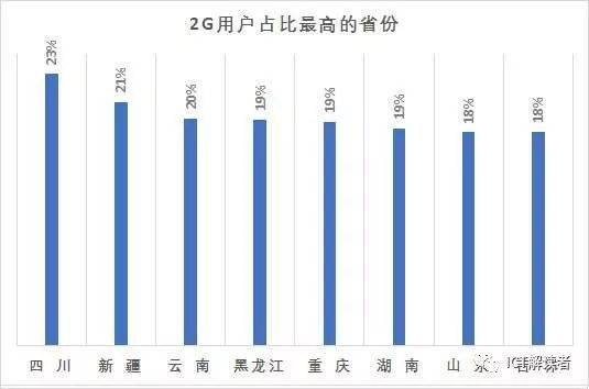 按照分省情况来看,有8个省份的2G用户数超过1千万,其中四川的2G用户最多,高达2220万;2G用户占比最高的8个省份中,同样是四川的2G用户占比超过23%。