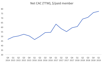 可以发现,过去 5 年 CAC 已经从不到 50 美元增加到 75 美元。