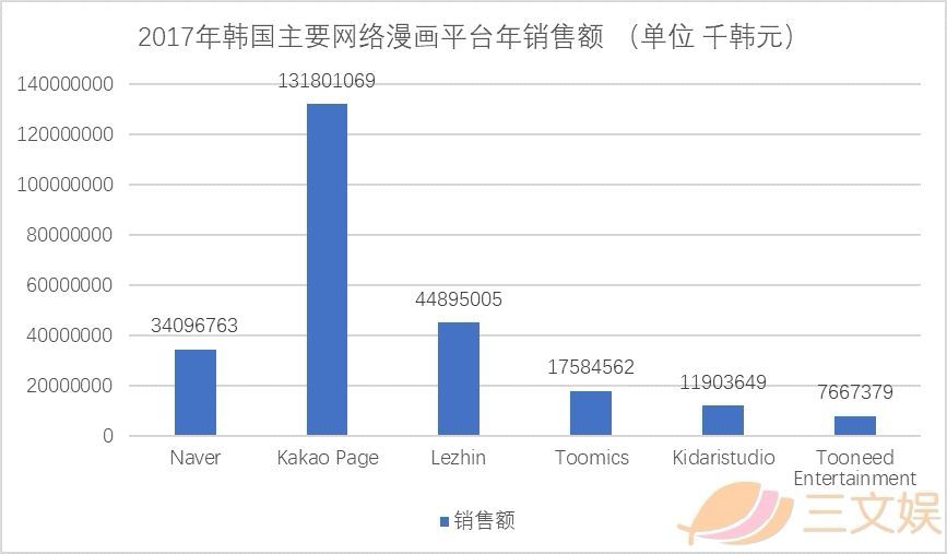 2017年韩国网络漫画平台增加至61个,作品总数达到9266部,作家总数6093人。在所有漫画平台中,Kakao以7.7亿的销售额超越了所有平台位列第一。但从用户使用情况调查结果来看,Naver Webtoon以81.1%的使用率远远超过了其他平台,最受用户欢迎。