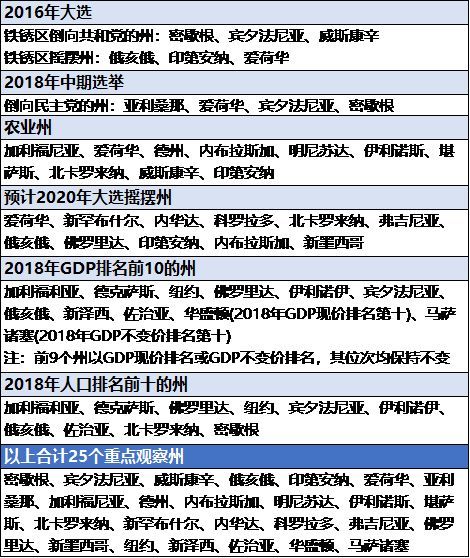 国泰君安宏观团队综合整理了2016年大选、2018年中期选举选票反转州、受贸易战影响严重的农业州,加上2018年美国GDP排名TOP10,人口排名TOP10的州,共计25个,进行了数据统计和分析。