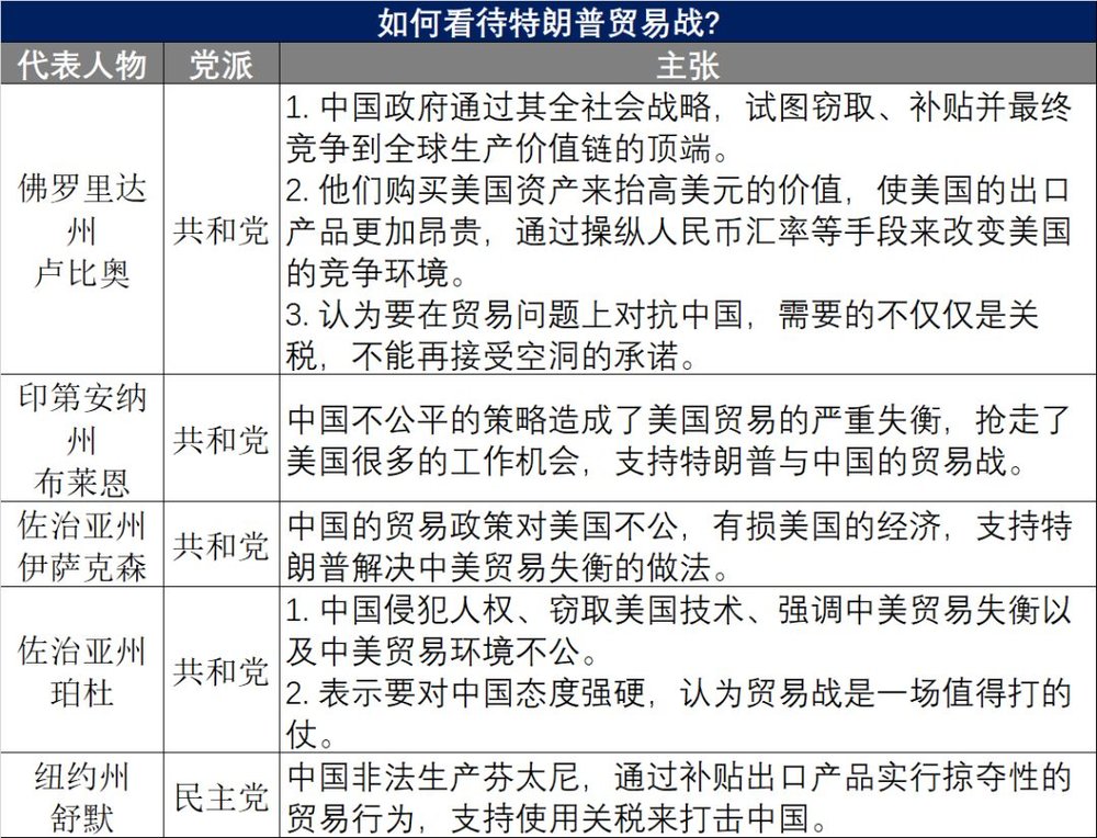 50位参议员就对华关系、中美贸易冲突的看法和关切点:
