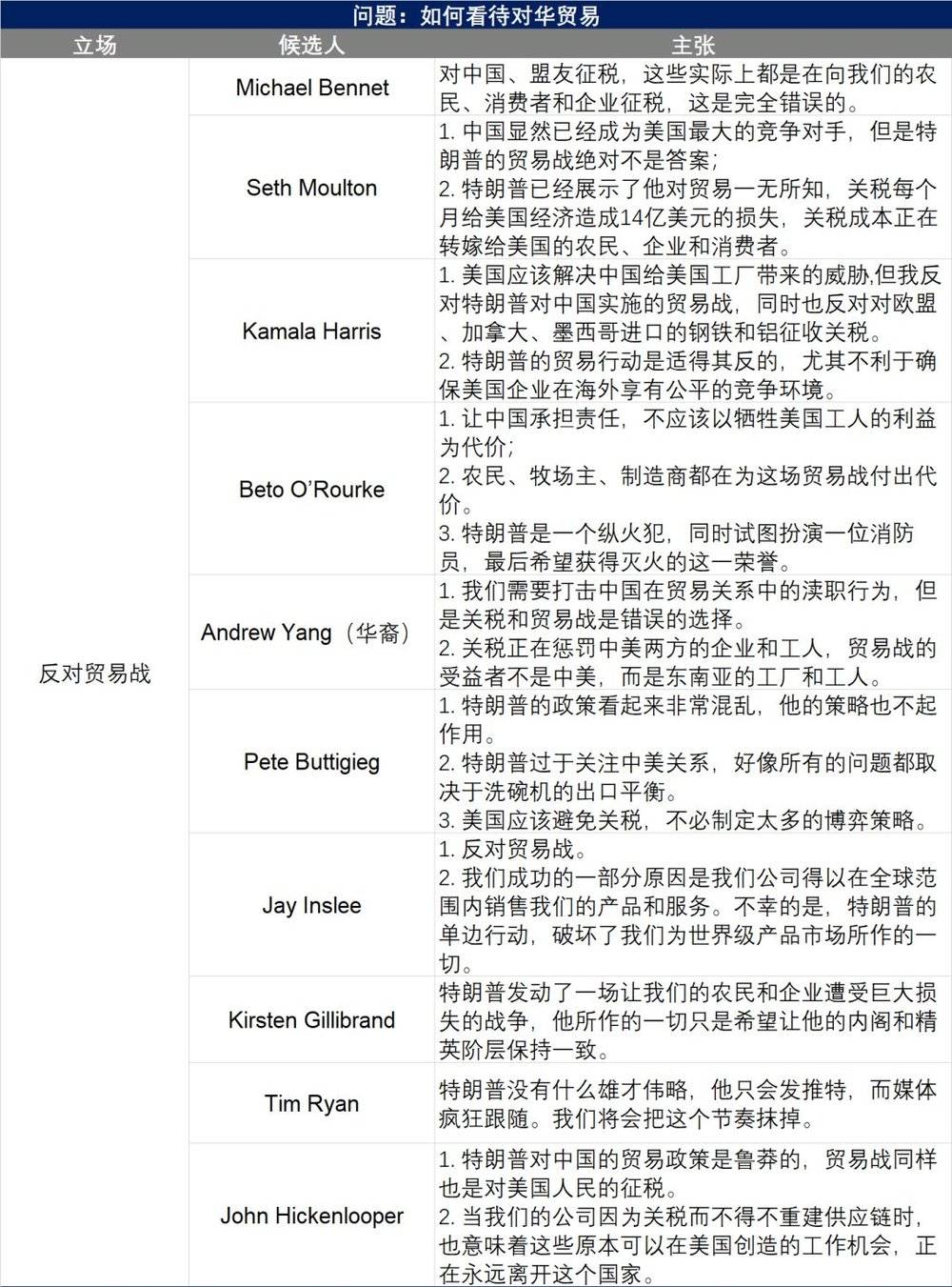 大部分民主党候选人表达了对特朗普贸易战的反对: