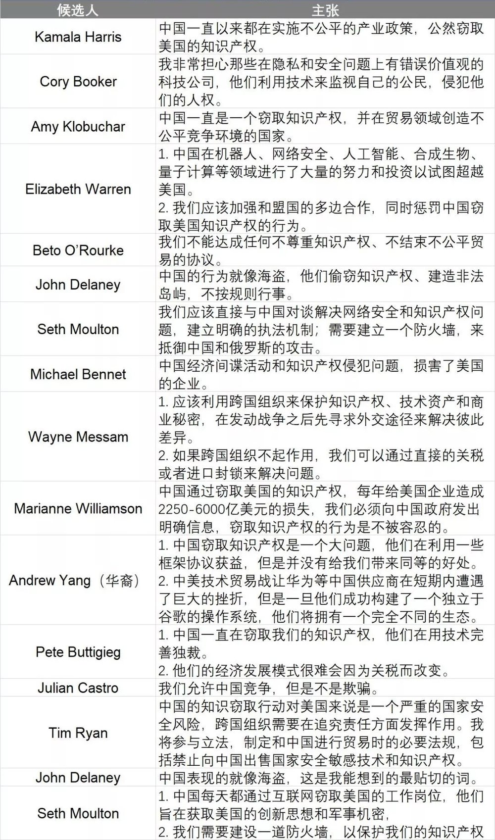 在涉及到中国知识产权相关的话题上,民主党候选人也是出现了一边倒的局面,共计有17位候选人在不同场合发表了对中国窃取美国知识产权的谴责。