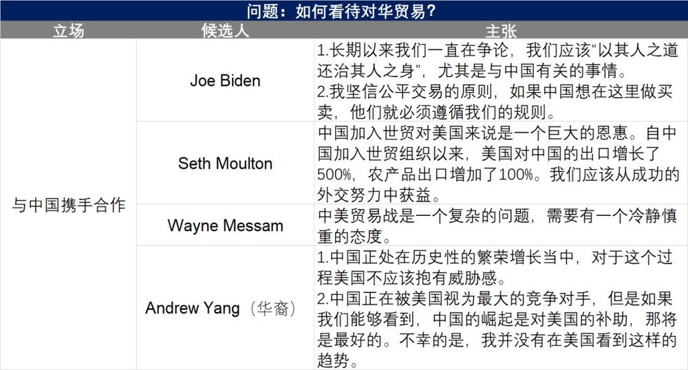 在24位候选人中,仅有4位表达了较为中立的态度,认为应该通过更为友好的贸易和外交手段,从中美经济的合作中持续获益。