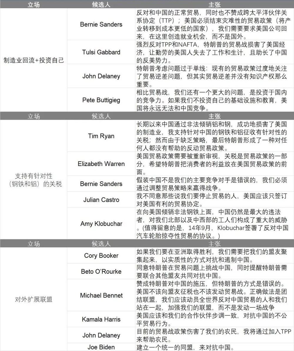 而就如何解决对华贸易摩擦一问,民主党候选人的立场基本分成了三个主要流派。