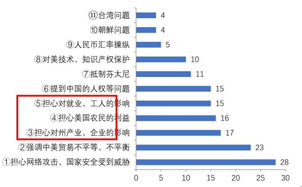 排在第2位的是,认为中国在中美贸易中以不公平、不平等、不遵守WTO规则等方式获得了不合理的竞争优势,进而影响了美国的出口和就业。