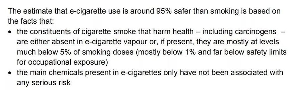 PHE在2015年披露过这样一份报告。这个结论主要基于两个事实:电子烟中的致癌物质要不在电子烟中不存在,要不含量低于5%的香烟含量;电子烟主要的化学物不会造成重大的健康危害。