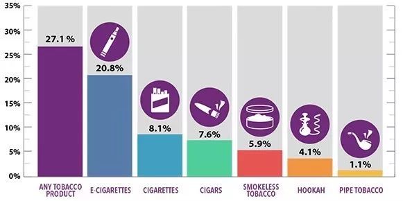 报告显示,高中生抽烟人群中有20.8%选用电子烟,是盒装香烟(8.1%)和雪茄(7.6%)等传统烟草制品的数倍。