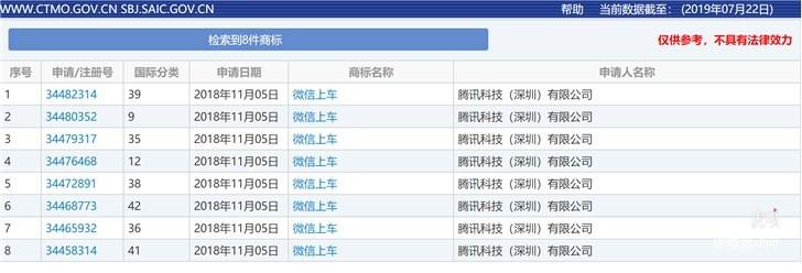 今年5月份,腾讯全球数字生态大会现场,腾讯车联副总裁钟学丹明确表示,腾讯车联已在生态车联网解决方案中集成了微信服务,并将与车企合作伙伴一起打磨,预计年内落地。目前,腾讯已经在国家商标局网站申请了8个“微信上车”商标。预示着车载版微信即将到来。