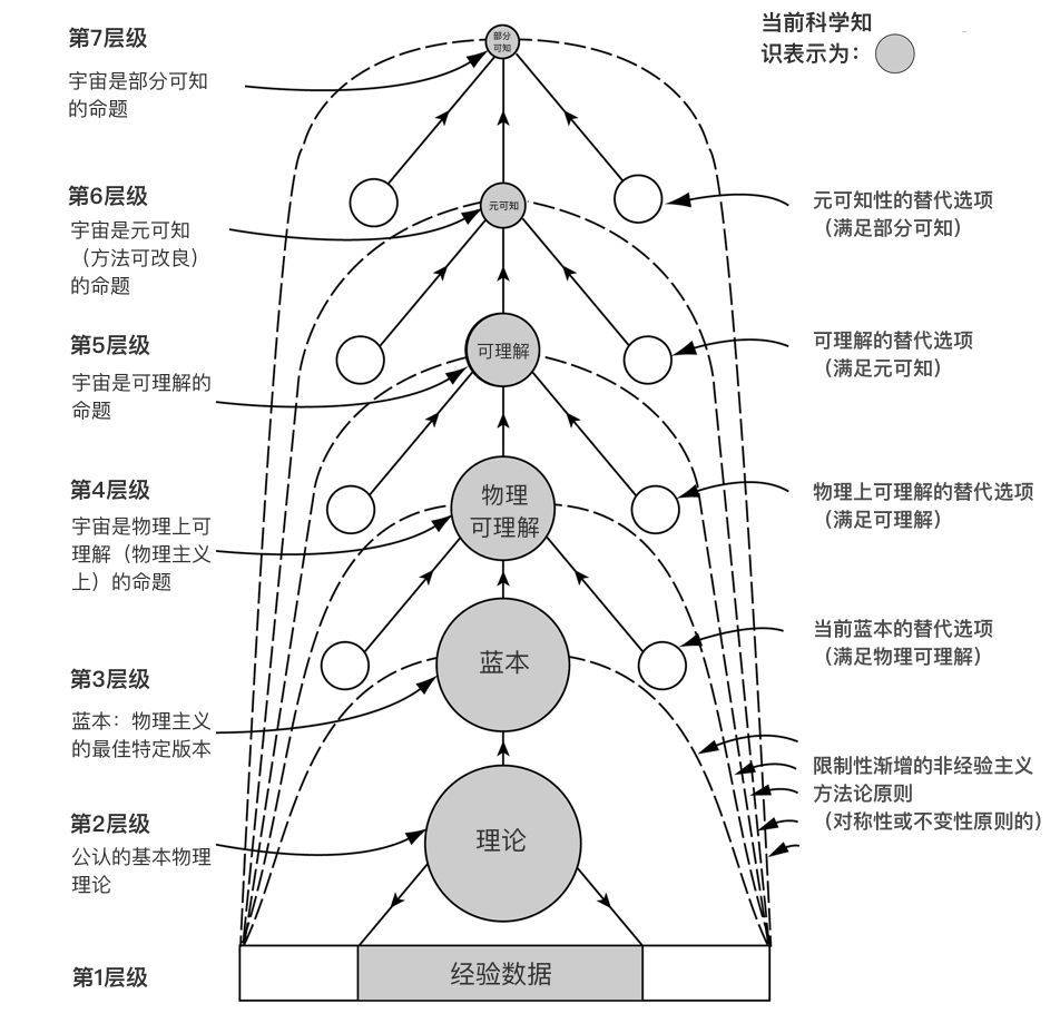 接下来是我们最容易接受的物理学基本理论——目前是广义相对论和所谓的标准模型(基本粒子和它们之间的力的量子场论)。再接下来,在层级的底部,我们有经验现象——通过实验建立的低层级经验定律。