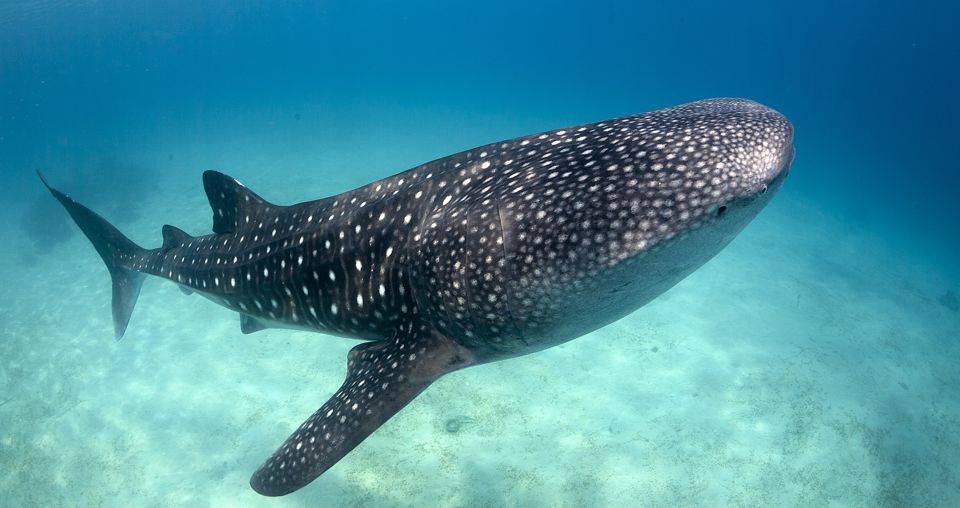 我来奥斯洛布的目的并不是观察这种鰕虎鱼。我离开了珊瑚丛,向海岸游去,这时光线突然变得暗淡,并非由于云朵的遮挡,而是因为一条大鱼刚好从我头顶游过,它正是我此行的目的——鲸鲨,世界上最大的鱼类。成年鲸鲨的体重可达34吨,是我体重的三百多倍,是小小鰕虎鱼体重的8个数量级,实在令人惊叹,如此庞然大物也是我们地球村的一员。
