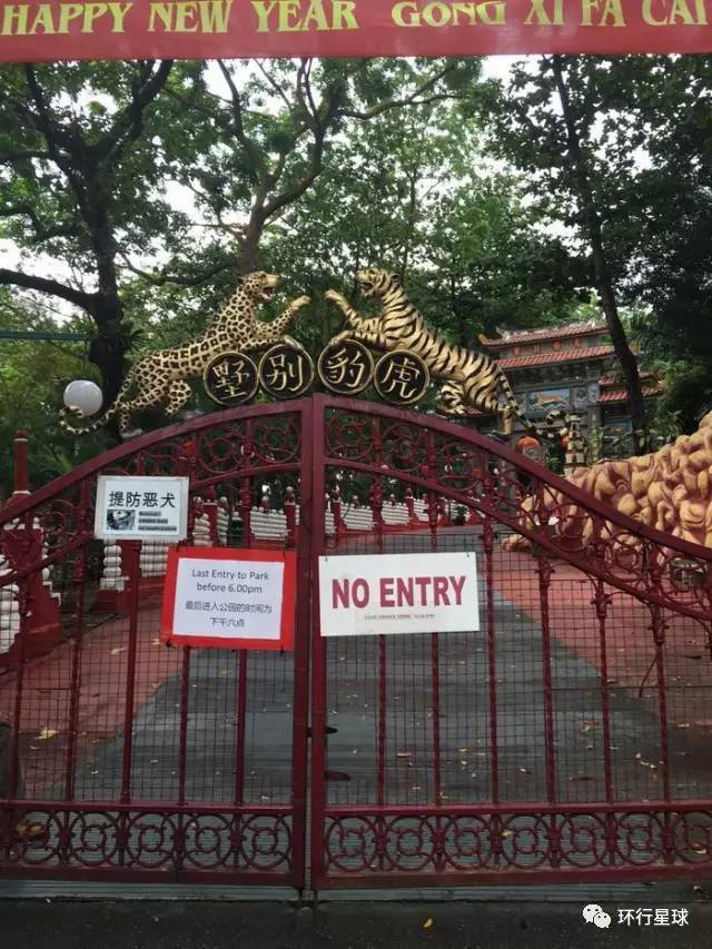 不用进门,从外面就能看到这种奇幻瑰丽的虎豹配色,门上这对金色虎豹可能是整个园区最严肃的一对虎豹了。虽然写了“提防恶犬”,但是我去了几次都没有看见恶犬,我估摸就是有恶犬在里面被虎豹的气场震晕了。