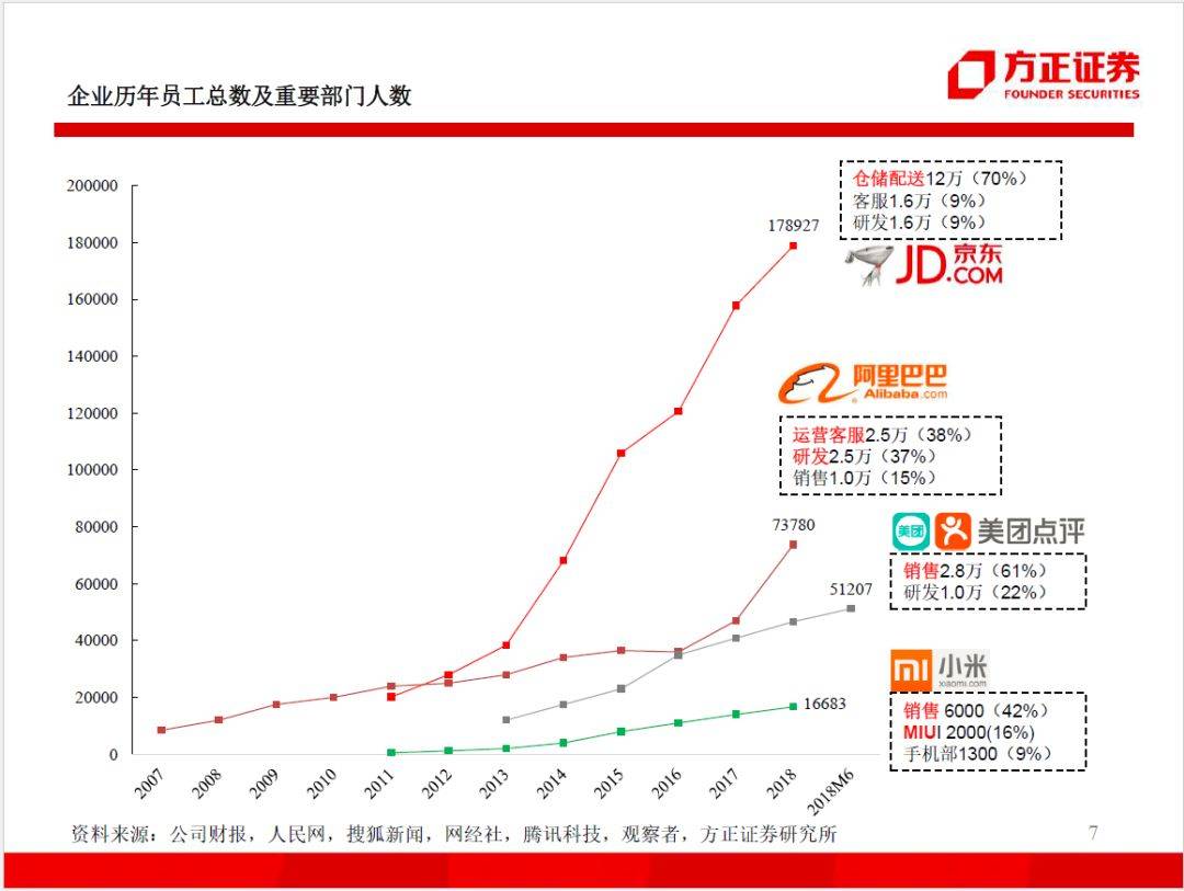 零售是传统的人力密集型行业,2018年末京东有18万员工(同期阿里7万、美团5万、小米1.6万),因此京东管理挑战来自如何管理基层岗位,管理方法类似军队。领导人高度集权,管理纪律严格,KPI设置鲜明,军事化管理使京东具备极强的执行力。