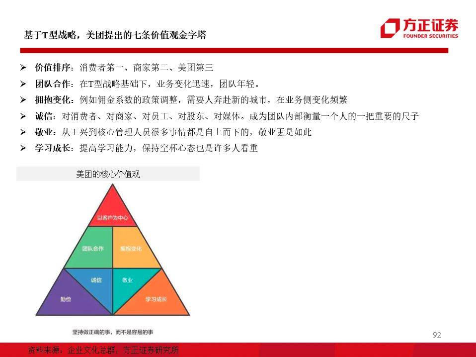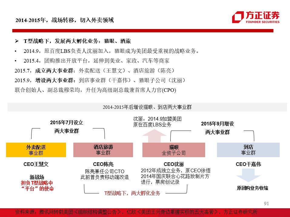 4)美团点评的组织仍在剧烈的变化中,其发展的过程中更多体现了“博弈论”的思想。美团早期从千团大战胜出,是背靠阿里融资、以及阿里B2B前副总裁干嘉伟打造的铁军。而在关键时刻转入腾讯战营,合并大众点评成立“新美大”,在短短时间内完成了垄断。这也是王兴等初创骨干更多是年轻一代高知精英有关。