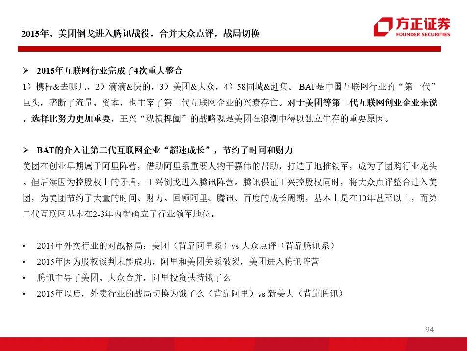 BAT是中国互联网“第一代”创业企业,三大巨头垄断了流量、资本后,也主宰了第二代互联网企业的兴衰存亡。在三大巨头和资本的主导下,2015年互联网行业完成了4次重大整合:1)携程&去哪儿,2)滴滴&快的,3)美团&大众,4)58同城&赶集。对于第二代互联网创企来说,选择比努力更加重要,王兴带领的创业团队由高知青年组成,具备全球化的战略视野,在千团大战中完成了两轮重要融资,借助资本力量梳理战局,在激烈的血战中存活并成为千亿级的流量平台。