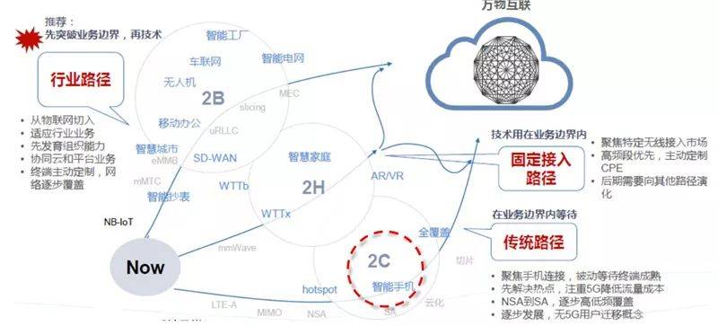 如下图所示,5G应用发展有三大路径,分别是2C、 2H和 2B。