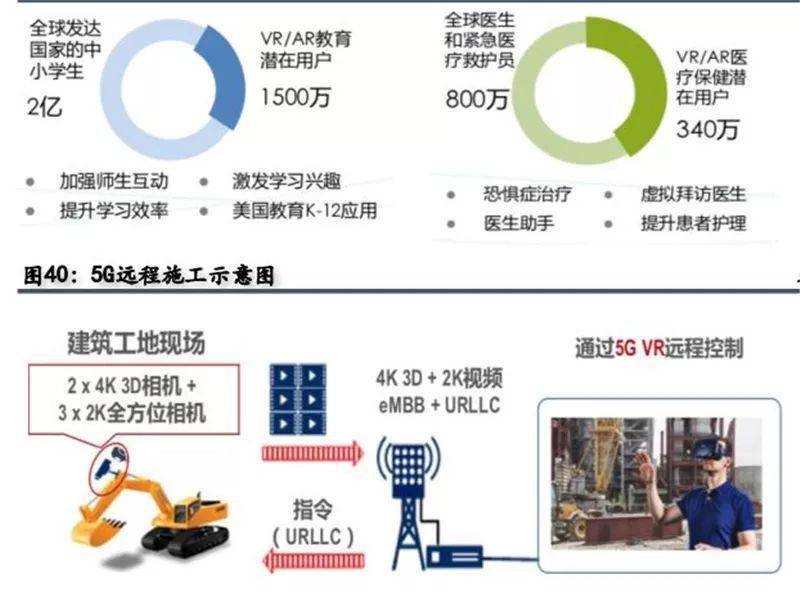 除娱乐(如直播、游戏、 视频)领域外, VR/AR还可广泛应用于教育、医疗、远程施工维保、车载导航等领域。