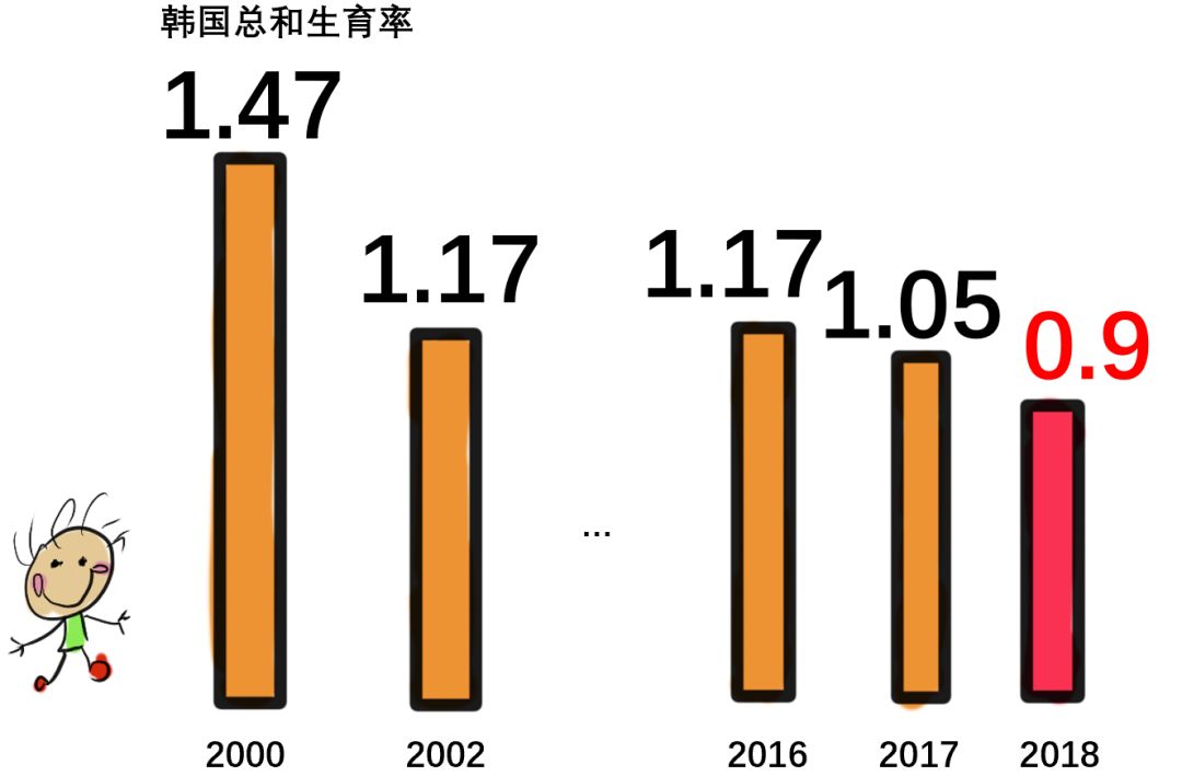 2018年,韩国总和生育率跌至0.9,为全球首个跌破1的国家,这在和平年代非常罕见。