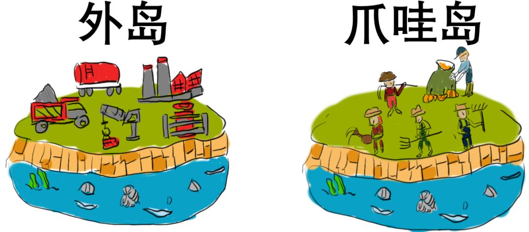著作中对比了印尼爪哇岛和外岛的情况,发现外岛由于殖民者的进入,产生了高效率、大规模的可用于出口的工业,从而极大提高了当地人的生活水平。