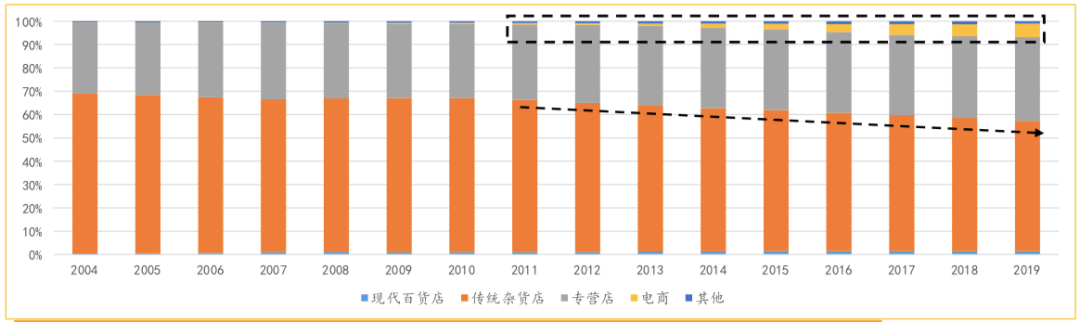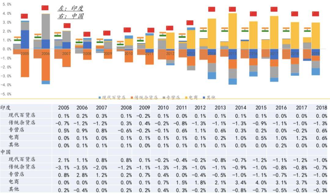 从结果上看,印度传统杂货店(市场占有率57%)平均每年释放1.1%~1.3%的市场份额,电商平均(市场占有率5.2%)每年渗透率提高0.6%~0.9%,专营店(市场占有率35%)平均每年渗透率提高0.4%~0.6%;但现代零售渠道(市场占有率1.4%)份额基本不变。