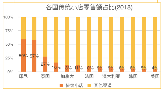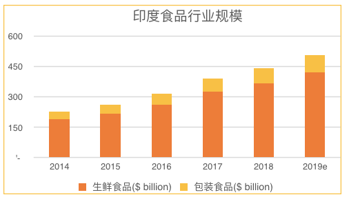 印度零售市场规模2018年为6310亿美元,年对年增速9%,并且其中63%的零售产品为食品和百货。