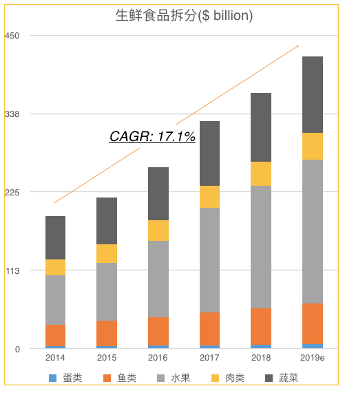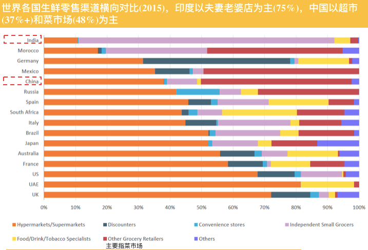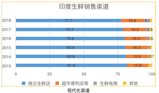在食品领域,大约80%是生鲜食品(3670亿美金),其中水果1751亿美金,蔬菜982亿美金,鱼类528亿美金,肉类350亿美金。在整个零售市场中,是以Kirana作为主导的零售业态(2017年统计,印度有1270万个Kirana,年增速0.5%),尤其是生鲜零售领域,这点和中国之前的菜市场为主导并逐渐向大超市转移的生鲜零售业态产生了较大的区别。