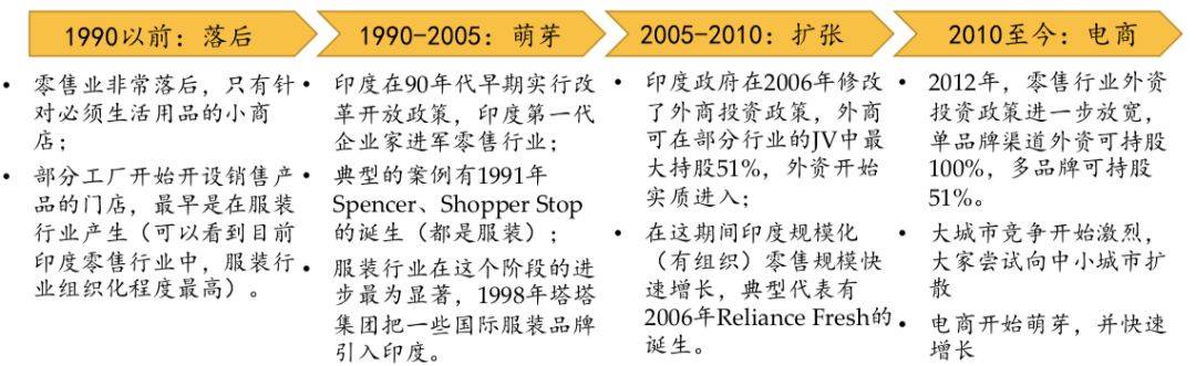 从政策端看,印度近些年在零售领域逐步开放外资投资管制,Kirana为代表的传统业态向连锁化、电商化转移趋势明显。但是与中国先进行连锁化整合再开始电商化不同,印度的零售行业在同时转移向电商平台和专营店的业态转移。