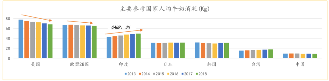 从下图中我们也可以看到,印度的人均牛奶消费相当于发达国家水平,处于逐年上升的趋势,远远多于中国人均的牛奶消费,也正是牛奶消费的刚需性,在后文中会提到一种印度特有的生鲜电商的商业模式。