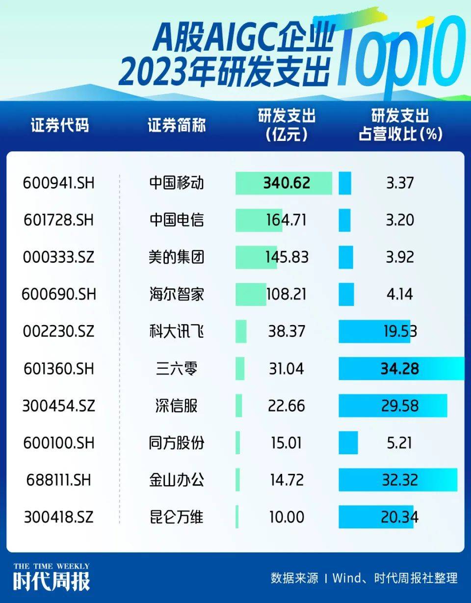 据时代周报记者梳理,55家AIGC企业2023年累计研发投入达到947.07亿元,中位数为1.09亿元;研发投入占营业收入比例中位数为5.21%;截至2023年末,研发人员总数达到16.96万人,其中18家企业研发人员占员工总数的比例超过3成。