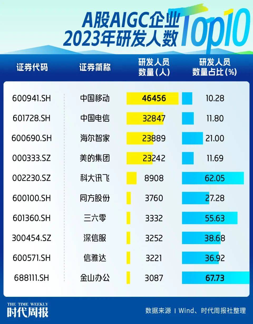 此外,金山办公(688111.SH)和科大讯飞(002230.SZ)的研发人数占比均超过60%,分别为67.73%、62.05%。