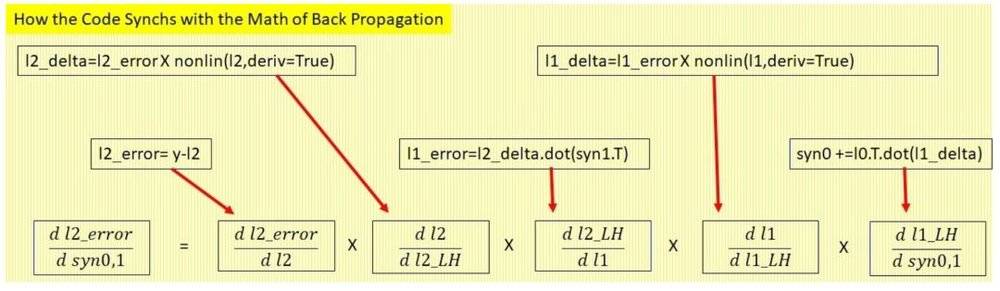 上图中出现了代码行66到115中的代码,红色线连接代码与变化率。如果你觉得这些连线不太对,这是因为原始代码将反向传播过程分解成了多个中间步和多个额外的中间变量。下面我们将从代码中移除以下四个中间变量:l2_error、l2_delta、l1_error和l1_delta。