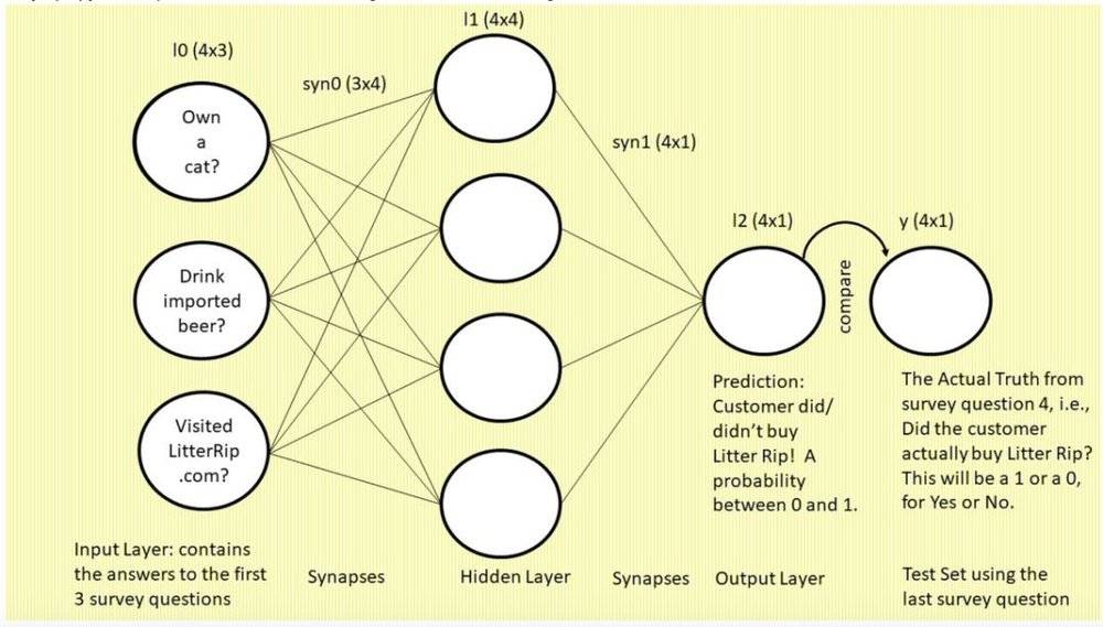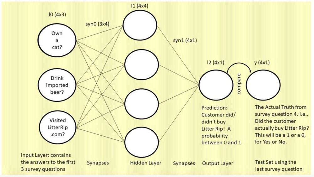 首先,你需要将之前顾客的调查数据和他们对前三个问题的回答输入到网络中,进行训练。该网络使用这些数据预测某位顾客是否确实购买了新款猫砂。然后网络再将预测结果与顾客第四个问题的答案进行对比。第四个问题的答案就是标签,作为事实供网络进行对比。例如,如果网络预测结果是“是的,我认为这位顾客买过Litter Rip! 猫砂”,而这位顾客第四个问题的答案确实是“Yes”,那么你就拥有了一个成功的神经网络。