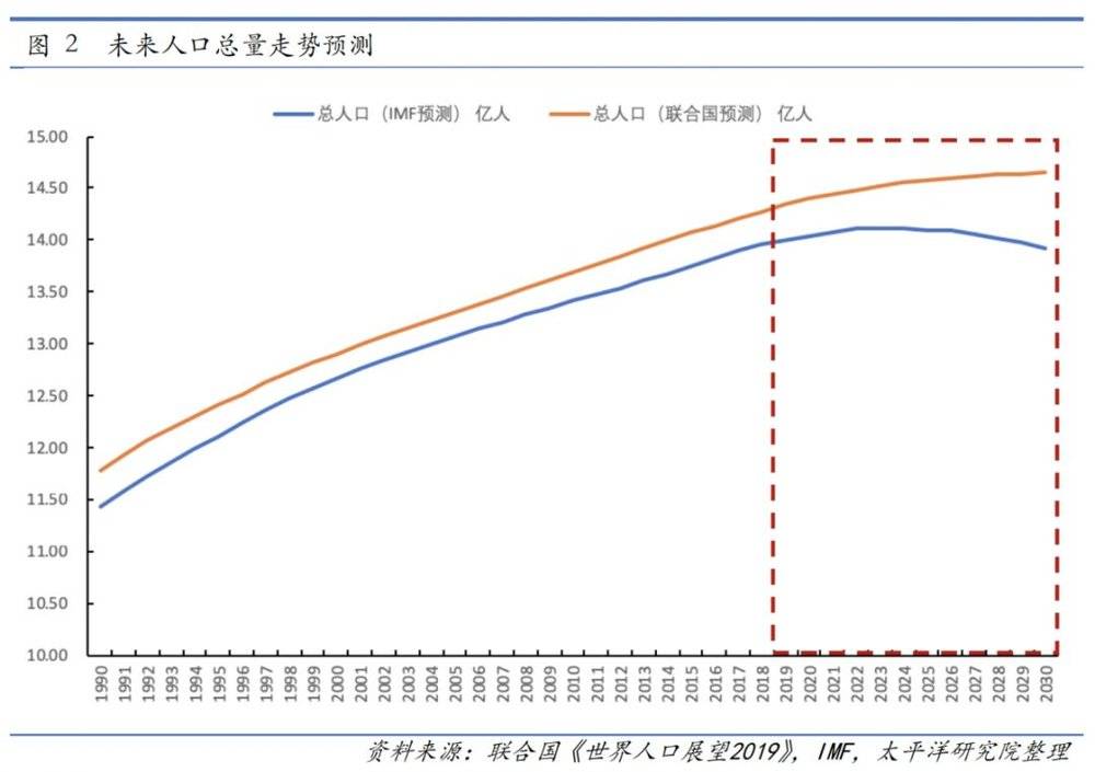 人口数量预测:本文使用了IMF和联合国的估计数据,IMF人口预测使用中国统计局的发布数据,IMF预测中国可能于2022年达到人口峰值,而联合国对于中国人口总量存在一定高估,其对于人口数量的统计大概高于国家统计局数据3000万~5000万人左右,联合国估计中国人口峰值可能于2029~2030年出现,学术界对于人口峰值和上下限的预测也都位于二者估计的区间内。本文我们使用IMF的估计数据作为人口预测的下限,联合国估计数据作为上限进行估算。